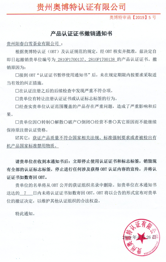 撤銷貴州陽春白雪茶業有限公司產品認證證書通知