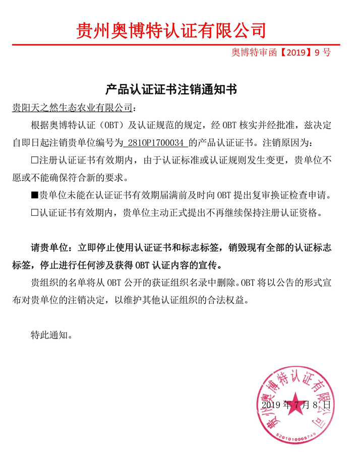 注銷貴陽(yáng)天之然生態(tài)農(nóng)業(yè)有限公司產(chǎn)品認(rèn)證證書(shū)通知
