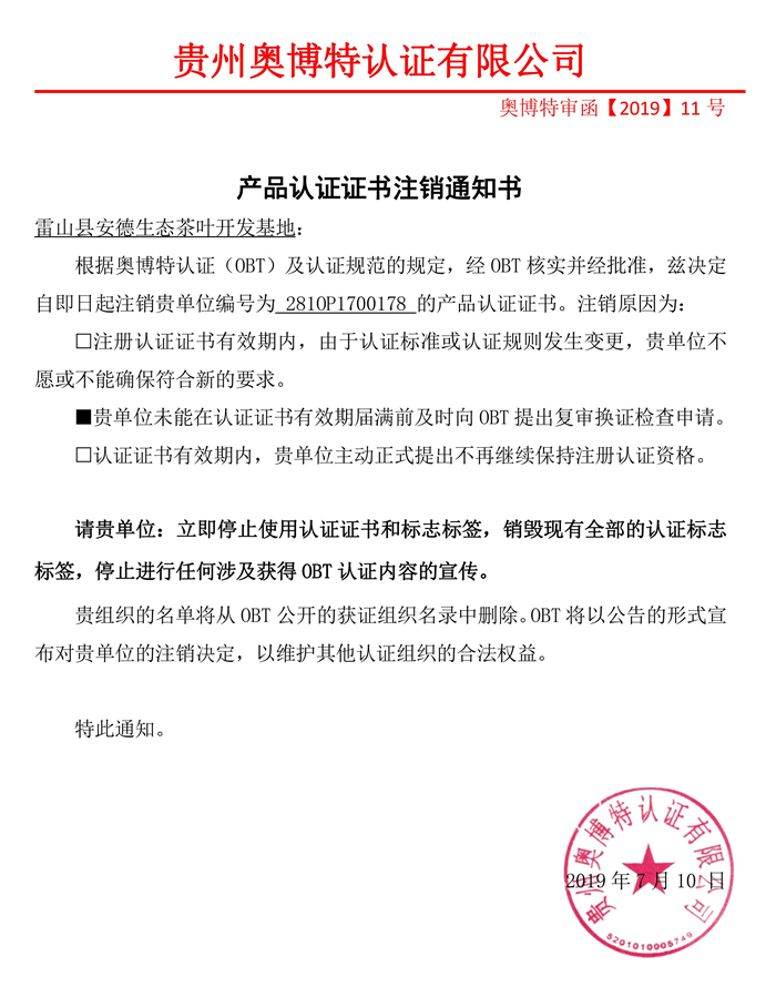 注銷雷山縣安德生態茶葉開發基地產品認證證書