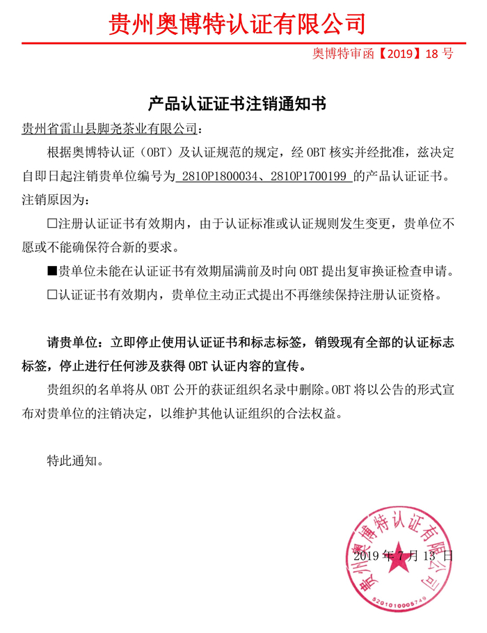 注銷貴州省雷山縣腳堯茶業有限公司產品認證證書通知