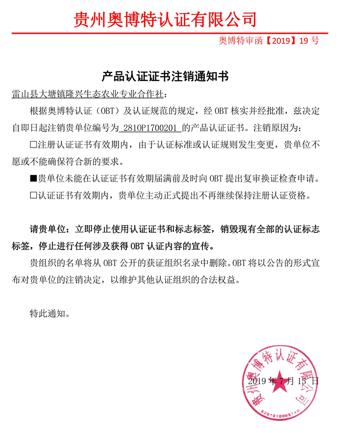 注銷雷山縣大塘鎮(zhèn)隆興生態(tài)農(nóng)業(yè)專業(yè)合作社產(chǎn)品認(rèn)證證書通知