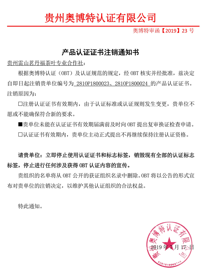 注銷貴州雷山茗丹福茶葉專業(yè)合作社產(chǎn)品認證證書通知