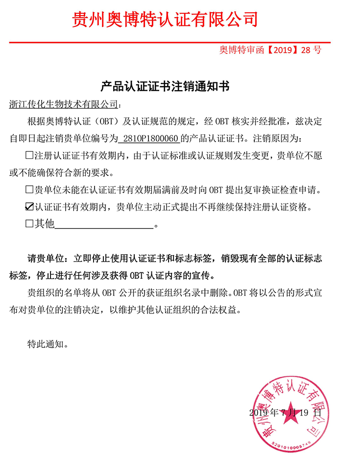 注銷浙江傳化生物技術有限公司產品認證證書通知