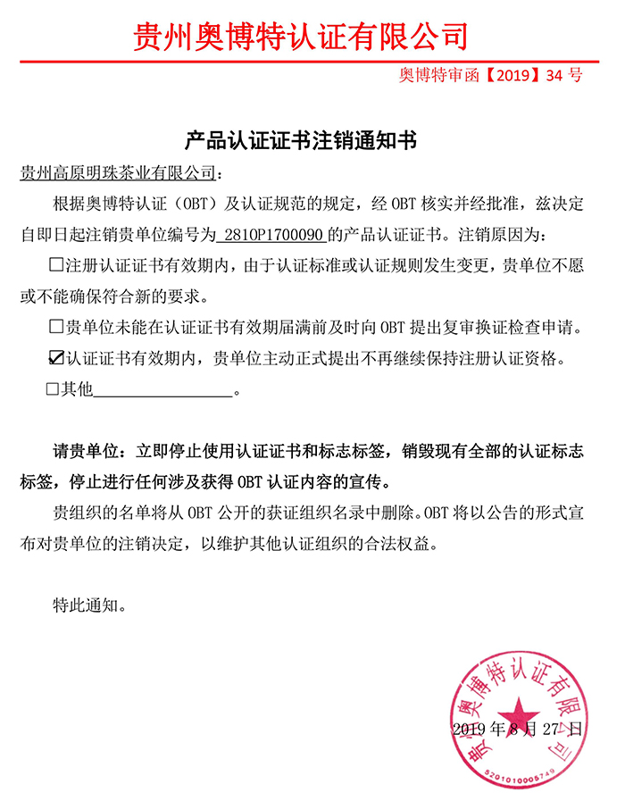 注銷貴州高原明珠茶業有限公司產品認證證書通知