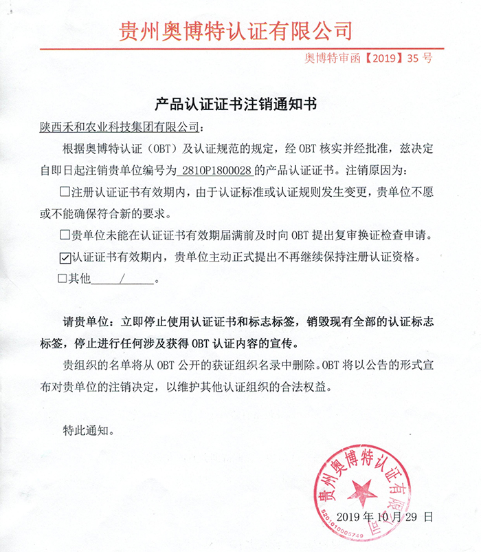 注銷陜西禾和農業科技集團有限公司產品認證證書通知