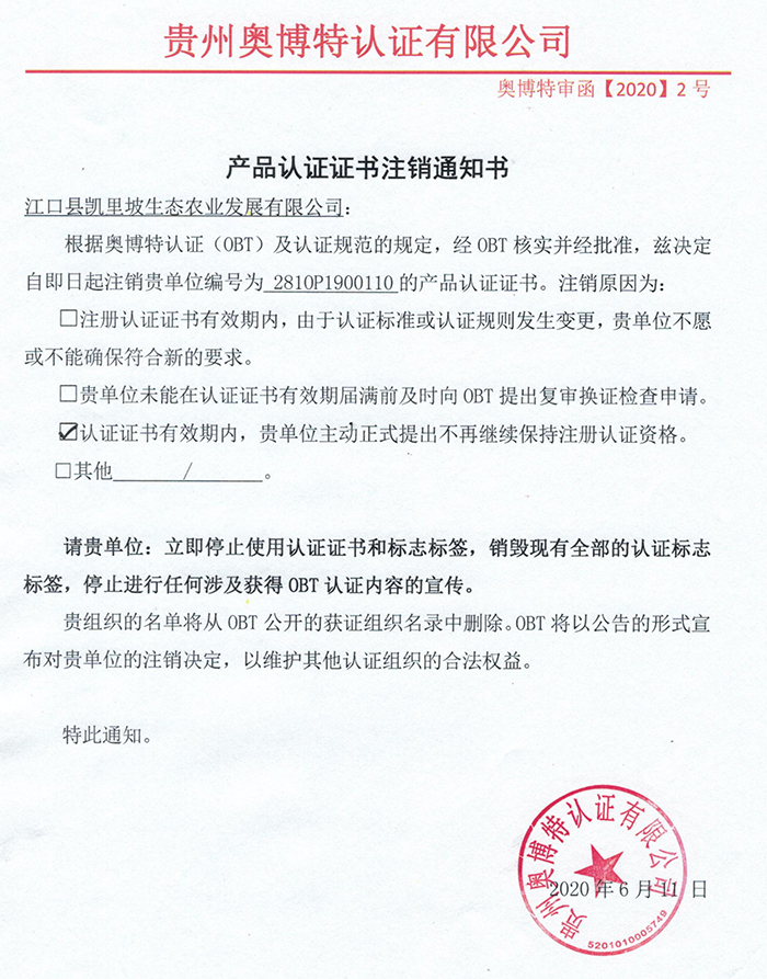 注銷江口縣凱里坡生態(tài)農(nóng)業(yè)發(fā)展有限公司產(chǎn)品認(rèn)證證書通知
