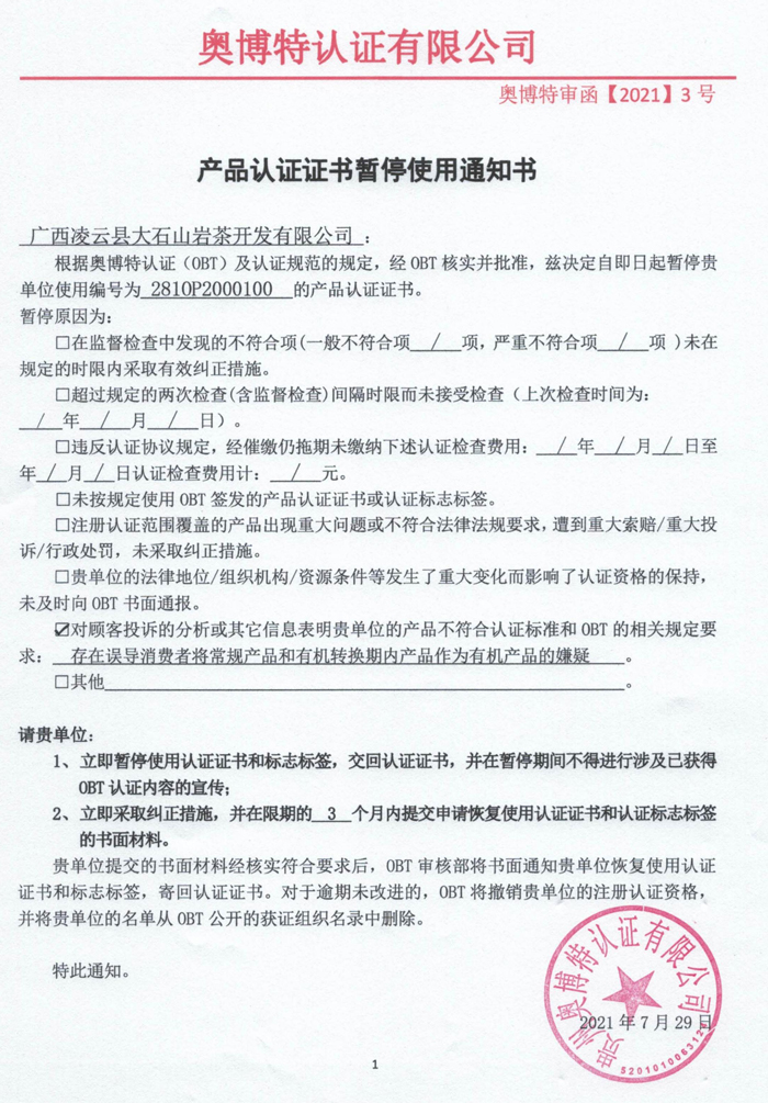 暫停廣西凌云縣大石山巖茶開發有限公司產品認證證書使用通知