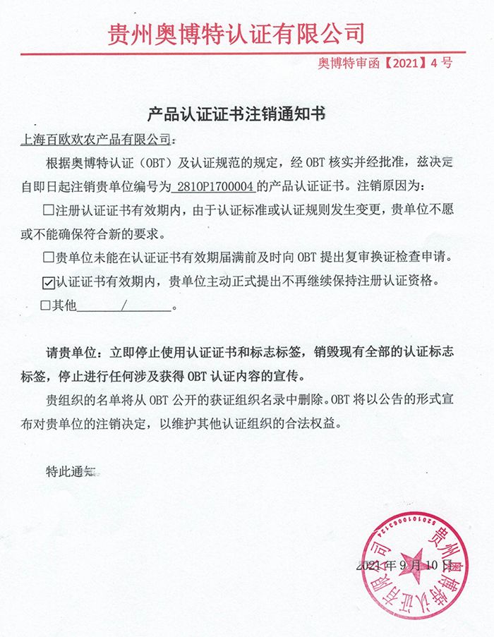 注銷上海百歐歡農(nóng)產(chǎn)品有限公司產(chǎn)品認(rèn)證證書通知