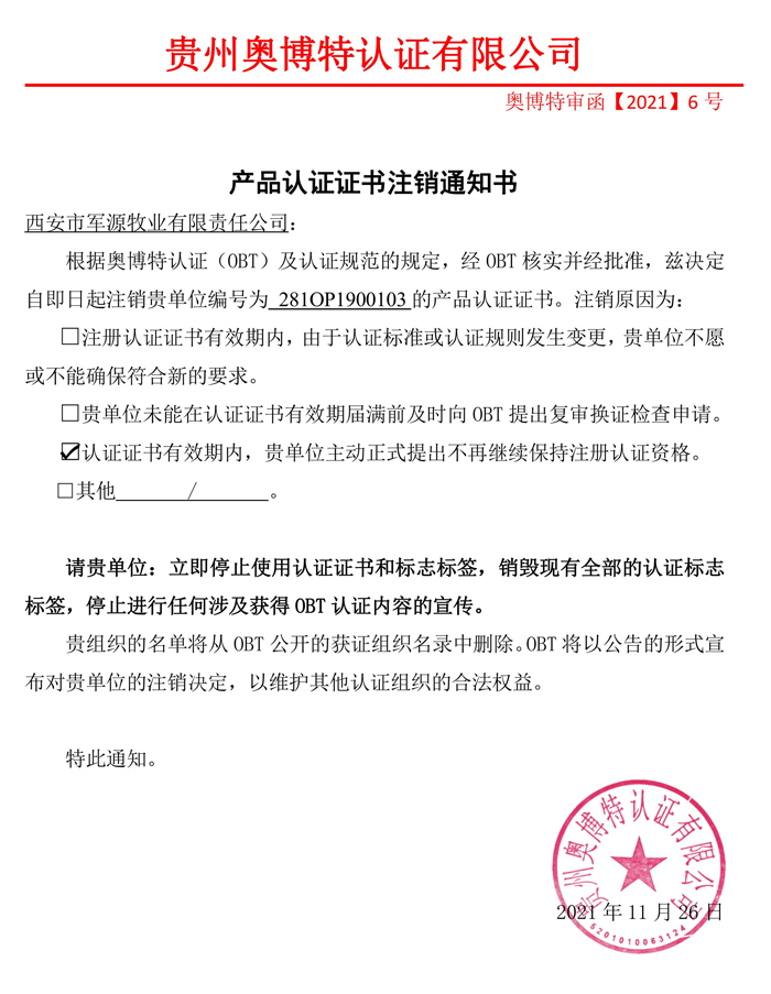 注銷西安市軍源牧業有限責任公司有機產品認證證書通知