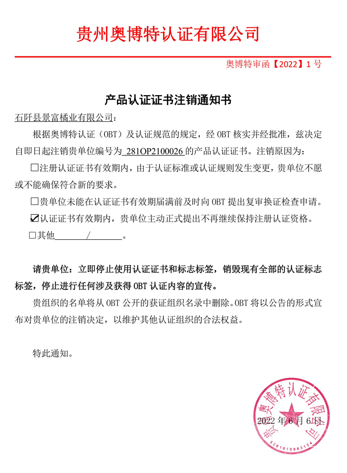 注銷石阡縣景富橘業有限公司產品認證證書通知