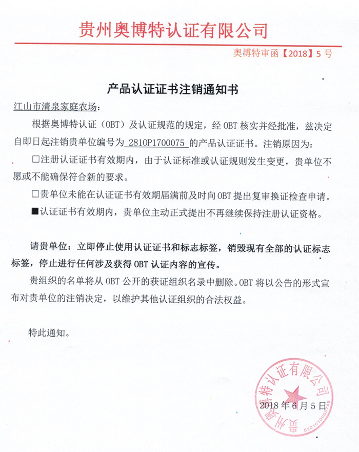 注銷江山市清泉家庭農(nóng)場產(chǎn)品認證證書通知