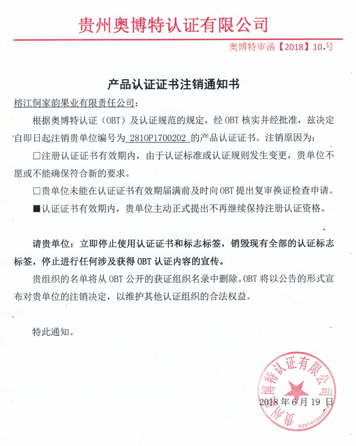 注銷榕江侗家韻果業有限責任公司產品認證證書通知