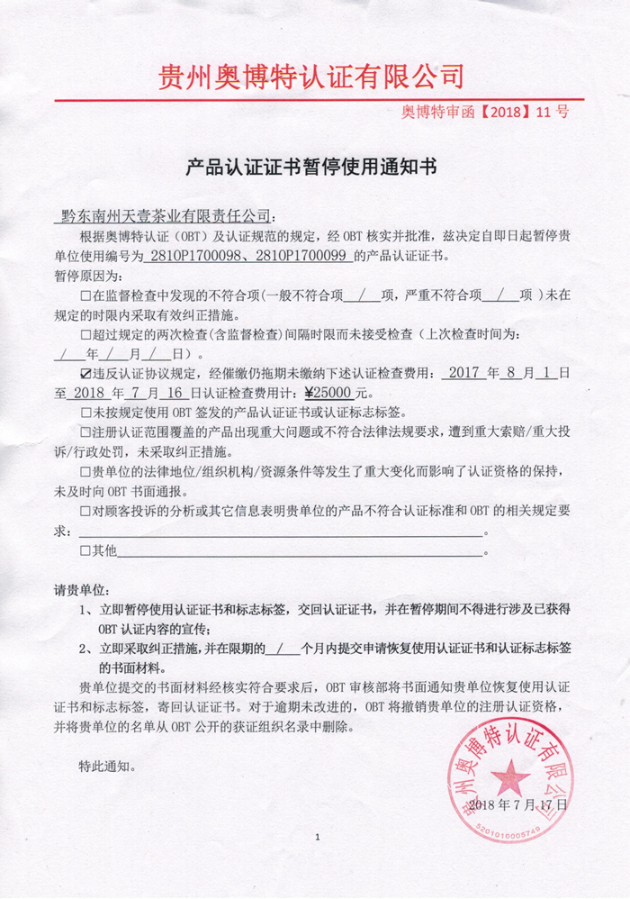 暫停黔東南州天壹茶業(yè)有限責任公司產(chǎn)品認證證書通知
